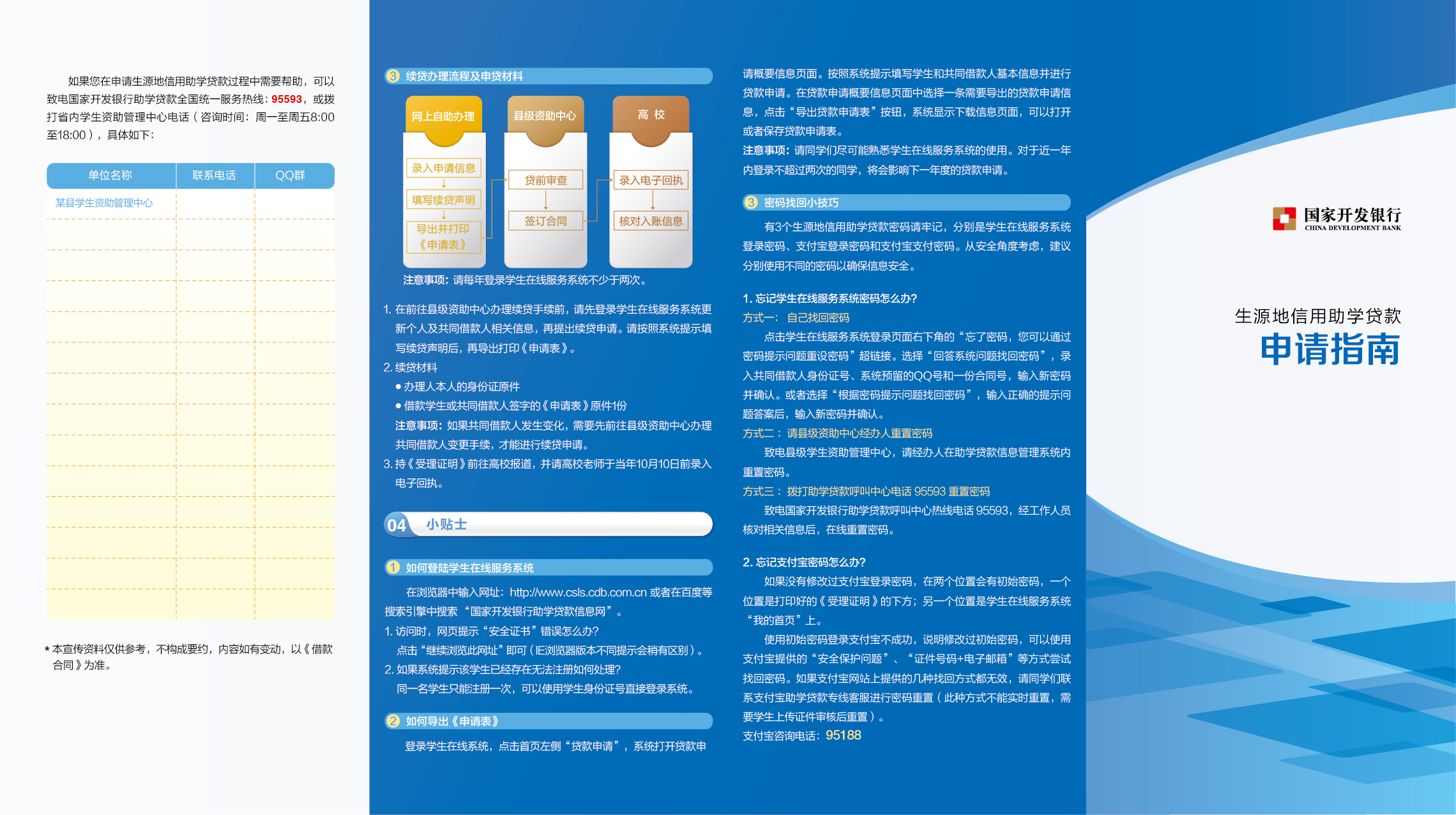 附件下载:· 生源地助学贷款政策和办理流程宣传动漫.mp4· 生源地助学贷款还款指南1· 生源地助学贷款申请指南2